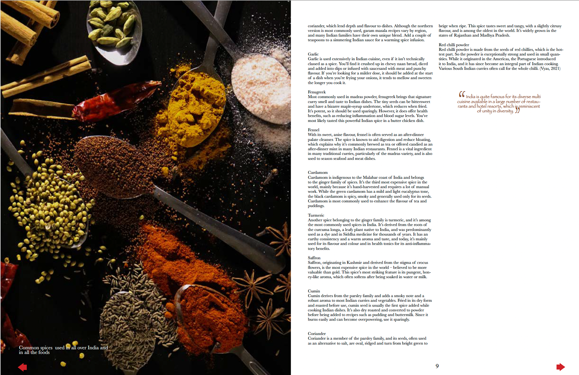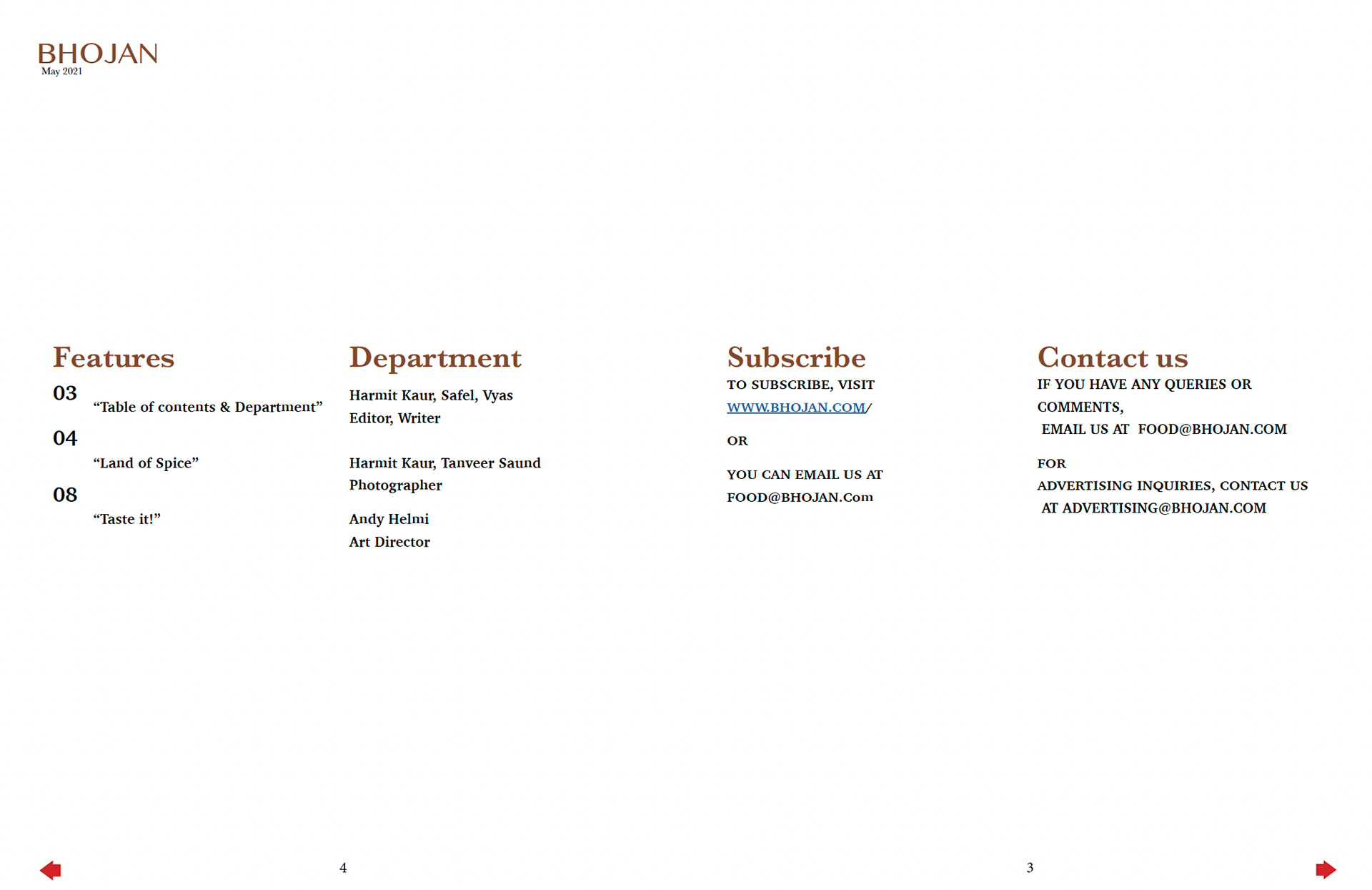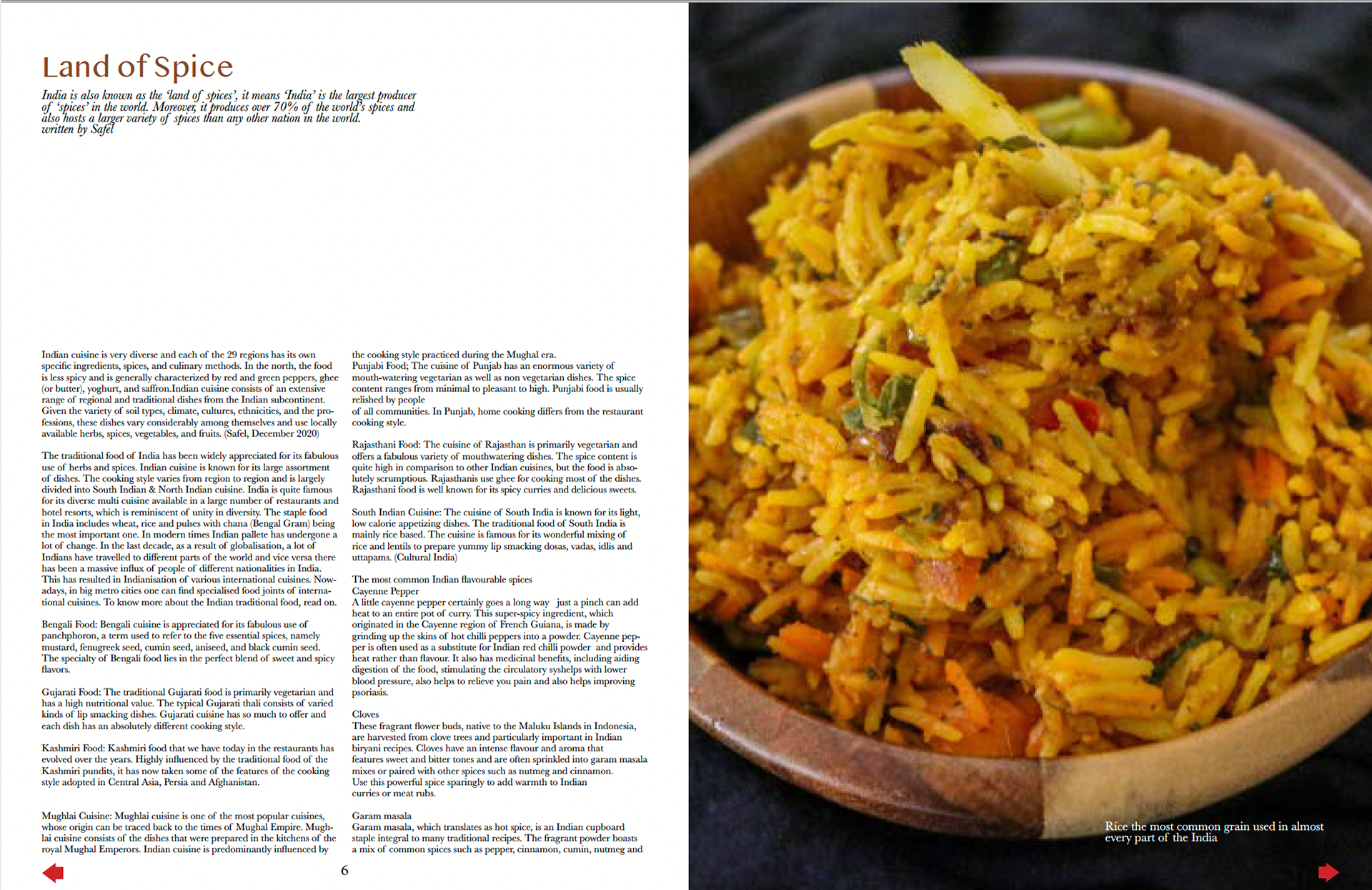This project is an interactive food magazine called Bhojan, This food magazine includes all the information about the spices and Indian food. It includes why India is called land of spices. How the spices are used and in what amount and what re their origins. This project also includes the recipes of Indian foods, how to make it and use the spices. These recipes are step by step so that it is easy to follow for everyone people who want to learn, or people who already know but want to know authentic recipes and also people who are not Indian and wants to make Indian food